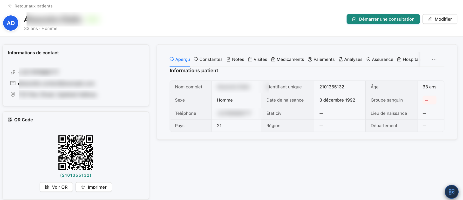 Douze onglets organisent toute l'histoire de santé du patient. Chaque service alimente le dossier sans ressaisie.